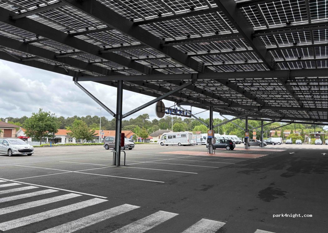 Supermarktparkplatz Leclerc mit einem überdachten Teil, sehr praktisch bei Sturm oder Hagel. Teil bedeckt verboten über 2m20, aber möglicher Zugang für höhere siehe Fotos.