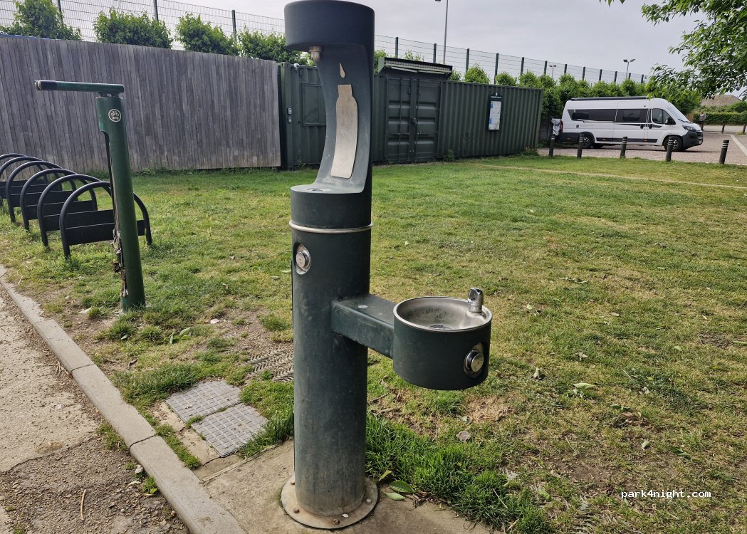 The height barrier was in the open position. Water tap was available to fill container but slow stream.