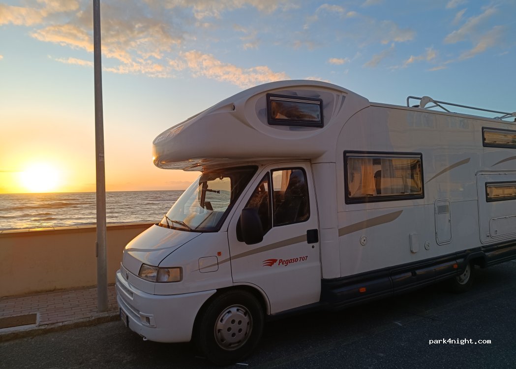 Siamo arrivati verso le 20 di Venerdì Santo. Abbiamo trovato subito posto e abbiamo preso una pizza da asporto in un localino qui vicino di fronte alla Conad (La Rinascita ) . Da Giugno a Settembre è possibile parcheggiare solo due ore nelle fasce orarie diurne. Siamo letteralmente a due passi dal mare! Era proprio la vista che stavamo cercando per una notte!