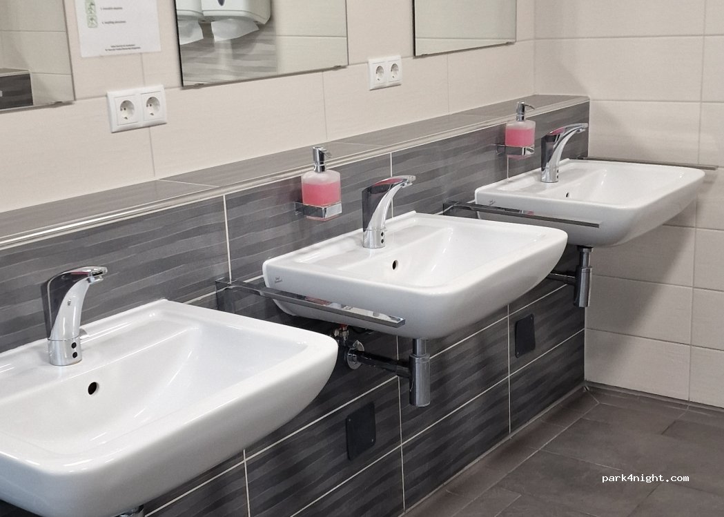 Parking space at the thermal baths, check in at the information desk in the thermal baths. The course is mostly paved and level. The use of the sanitary facilities is free of charge. It is important to ensure that there are no puddles of water on the floor that could contaminate the system. Please keep the doors closed at all times. You can use the shower with a coin toss. The devices must be handled with care and the instructions for use must be followed. Tokens for using the washing machine and dryer are available at the information desk. Glass bottle exchange Mon. -Wed. and Fri. from 7:30 p.m. to 8:00 p.m.