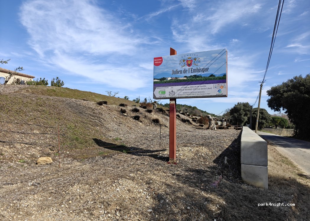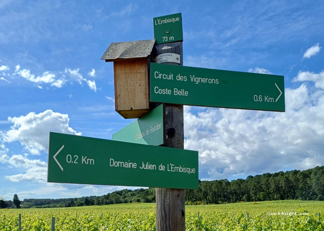 A perfect place for a free overnight stay. part of French Passion ... but you don't need to be a member to stay for free. Parking is on level ground in a space between the vines. We walked along marked paths through the vineyard. No pressure to buy wine... but of course we did. No services. Just a peaceful night.