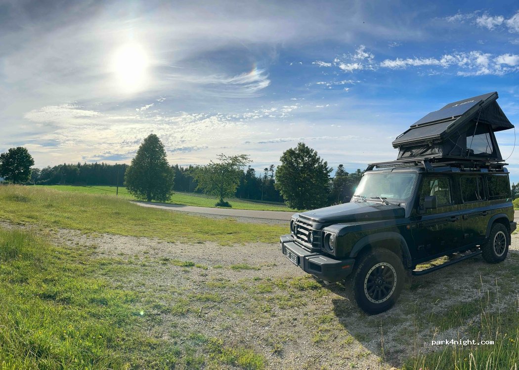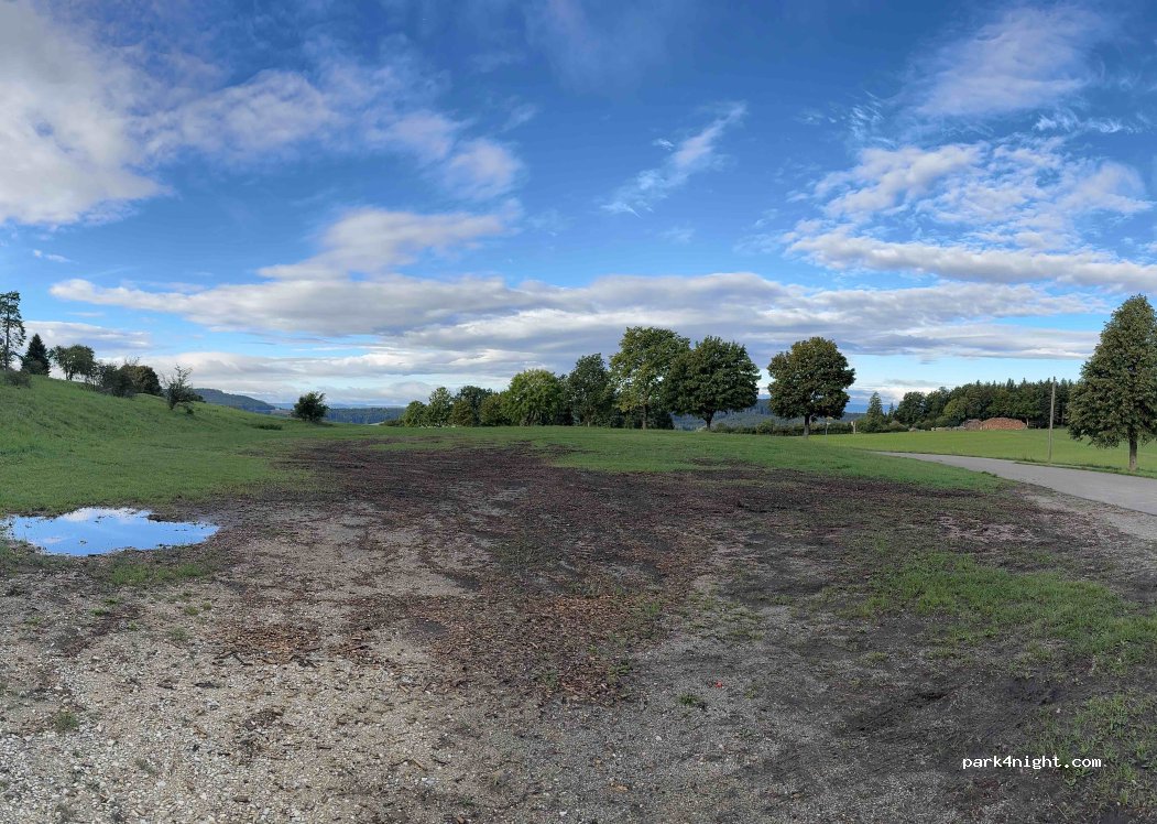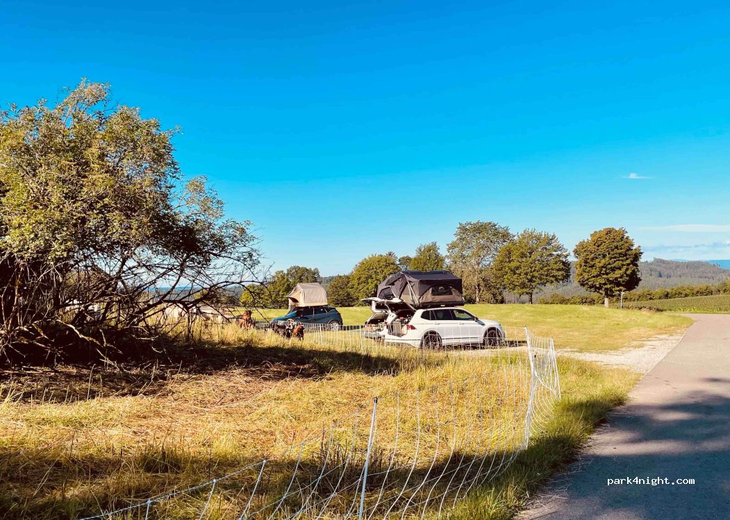 Interdiction de stationnement de nuit. Parc de randonnée à Lupfen avec vue sur la Forêt-Noire. L'accès est assez étroit et donc pas prévu pour plus de 3,5 tonnes. Refuge à 50 m avec barbecue. Occupé par les jeunes habitants en été.