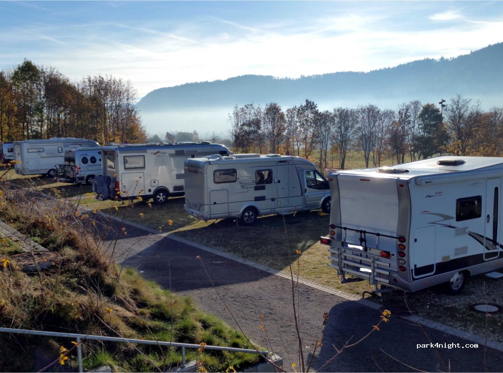Las 16 plazas de aparcamiento son planas, parceladas y de generosas proporciones. Las instalaciones incluyen una máquina expendedora de tickets de aparcamiento y columnas eléctricas que funcionan con monedas en las parcelas. En la zona de entrada restringida del camping situada arriba se encuentran opciones separadas de suministro y eliminación con columna de agua dulce, entrada en el suelo y contenedores de basura. El resto de instalaciones del camping, como sanitarios, lavadoras, secadoras, etc., se pueden utilizar previo pago. La pequeña tienda del camping ofrece café, servicio de panecillos y mucho más.