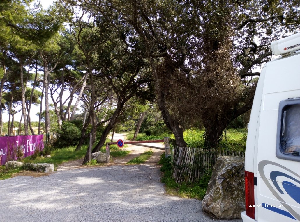 pas de hauteur limitée quelques places le long du chemin et un accès sympatique jusqu'à la plage de la Badine. 1 nuit tranquille mi mars, attention aux moustiques !