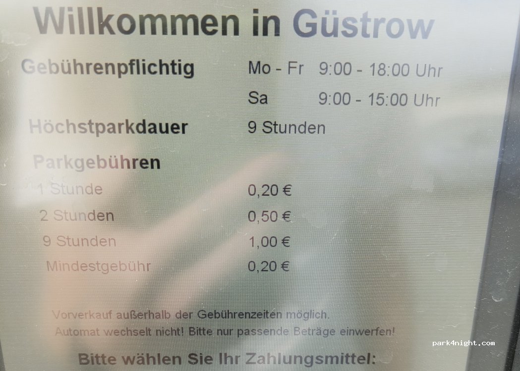 Kostenpflichtiger Parkplatz am Rande der Innenstadt, nachts ruhig. Eine, zwei, oder neun Stunden möglich.