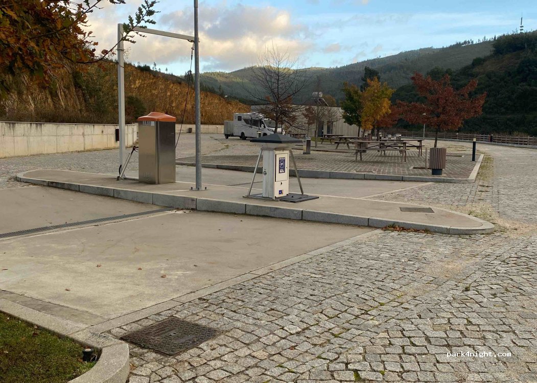 Complete motorhome area (also motorhome washing machine) in mountainous Cabril river valley, about 600m away from PAMPILHOSA DA SERRA village center and nice river beach. Flat but without shadows; few picnic tables.