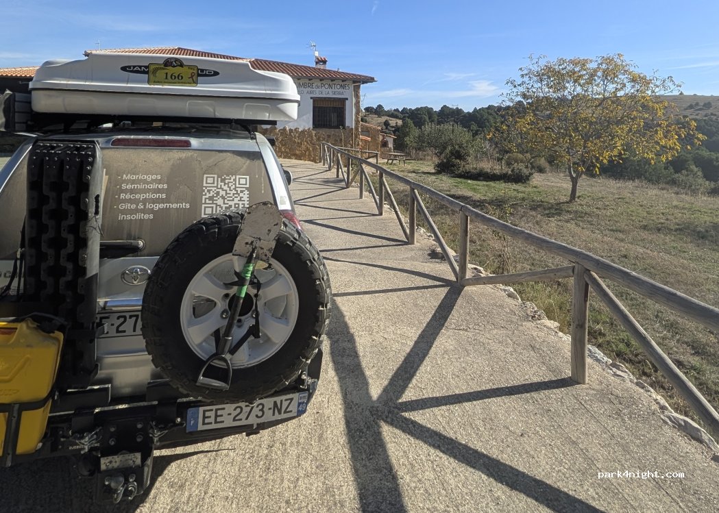 Emplazamiento único para dormir en el parque sin pasar por un camping. La familia muy amable y ofrece los servicios de vaciado y llenado por 8€ la noche. Zona de mesas con sombra para comer con unas vistas excelentes. Venden jamón y quesos riquísimos allí mismo. Recomendable 100%