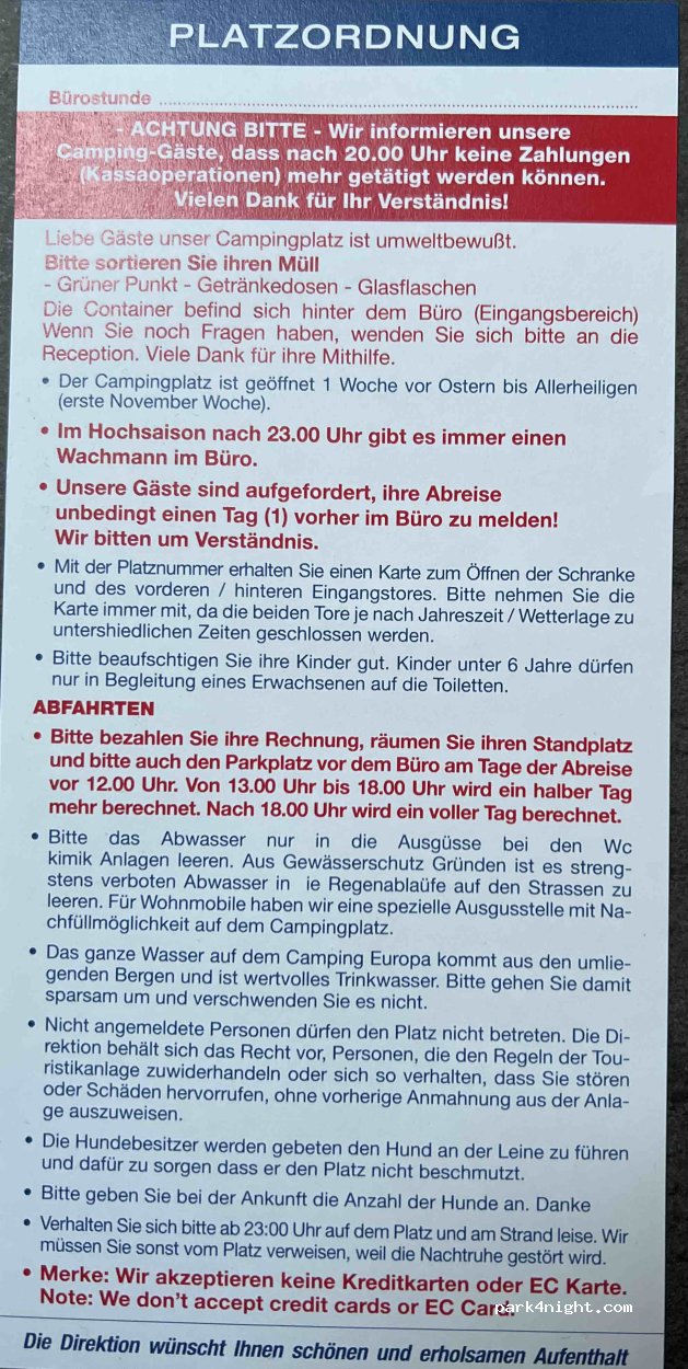 Waren heuer Ende September das dritte mal bei Camping Europa. Der Platz liegt perfekt und direkt am See. Für größere Wohnmobile sind sowohl die Wege am Platz, als auch die Stellplätze nicht ausgelegt. Leider wurde in den letzten Jahren nicht viel getan. Sanitäranlagen sind zwar sauber, jedoch teilweise sehr schadhaft. Die Stellplätze bei Regen sehr matschig.