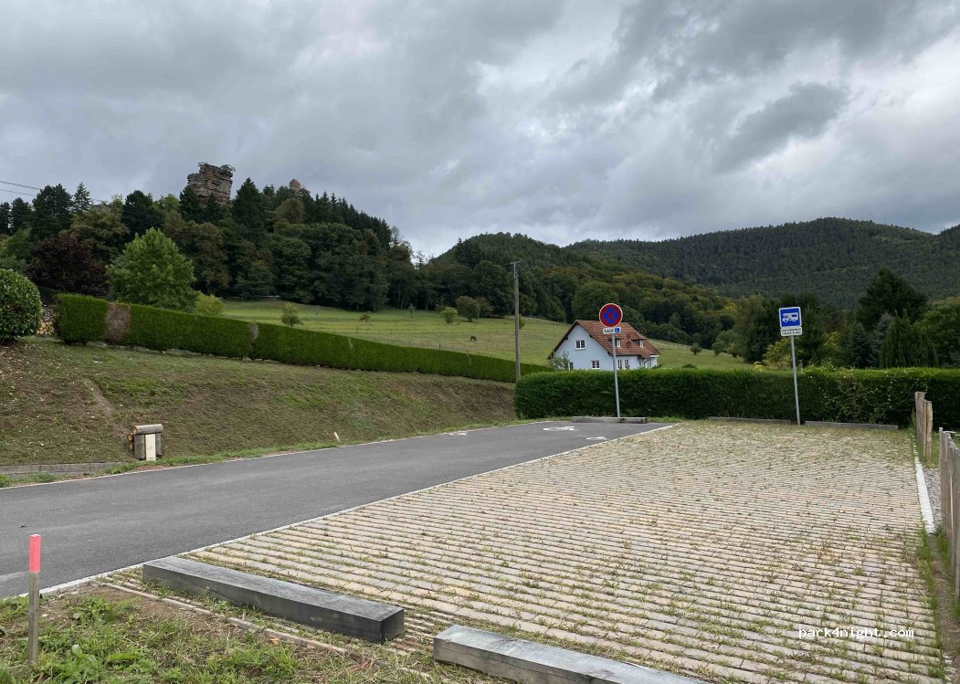 Parking du vieux château de Windstein. Au calme, mais un peu en pente. Dans un petit village magnifique. Accès par petite route mais tout à fait réalisable même avec un grand camping-car.