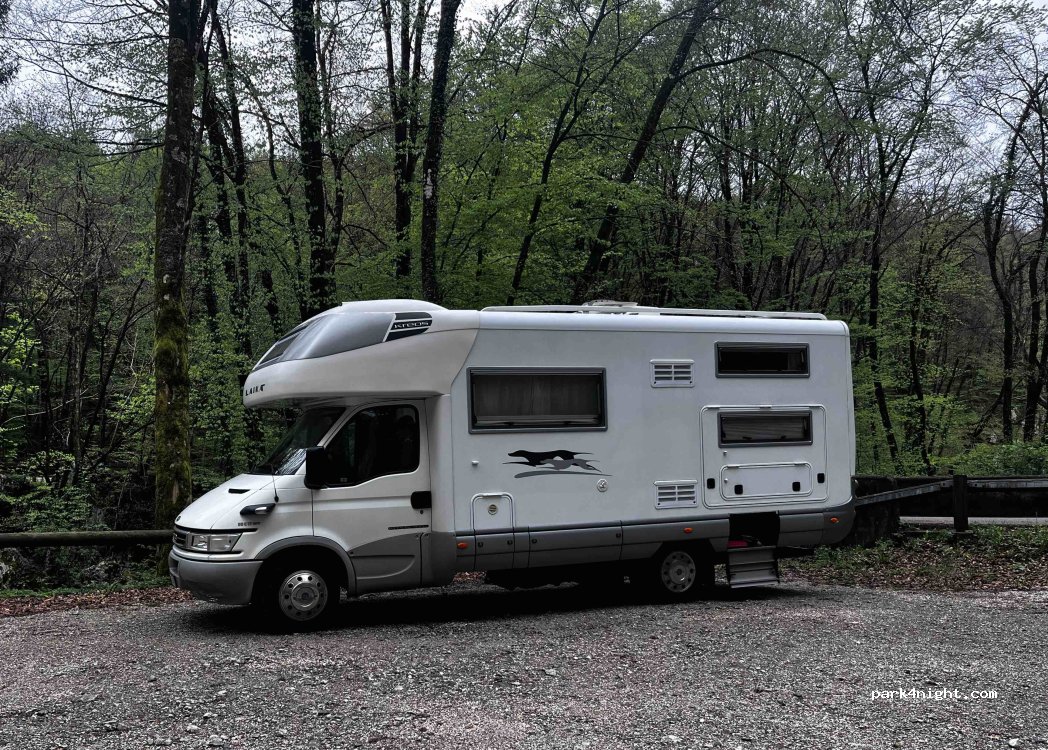 Toller Platz! Um diese Jahreszeit standen wir alleine dort, ausser ein paar Durchreisende, die ihr Abwasser entsorgt haben. Leider hat natürlich nichts mehr offen, aber prinzipiell ist die Grotte, ein Restaurant und ein Spielplatz nur 2,3 Minuten zu Fuß entfernt. Es gibt zwei offizielle Campingparkplätze, wir standen auf dem unteren, der sich vor allem durch das tolle Bachrauschen auszeichnete. Eine kleine Brücke über den Bach führt direkt zu einem süßen Wanderweg. Die Fahrt nach oben ist teilweise sehr steil und kurvig aber mit etwas Mut kein Problem! Paradiesisch!