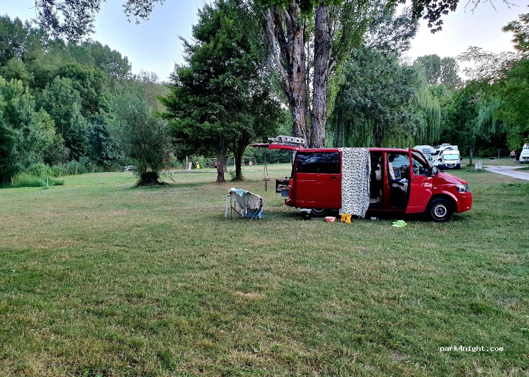 Nuit au printemps en van aménagé: camping très spacieux, plat et calme au milieu des arbres. Emplacement libre, bornes électriques sur les emplacements, 1 point eau usées,vidange WC et eau propre . Jeux pour enfants, table ping pong, terrain de volley. Douche et wc vétustes non chauffés, machine à laver. Prix 16E , 1 adultes, 2 enfants avec électricité. 4 étoiles pour les douches non chauffées.