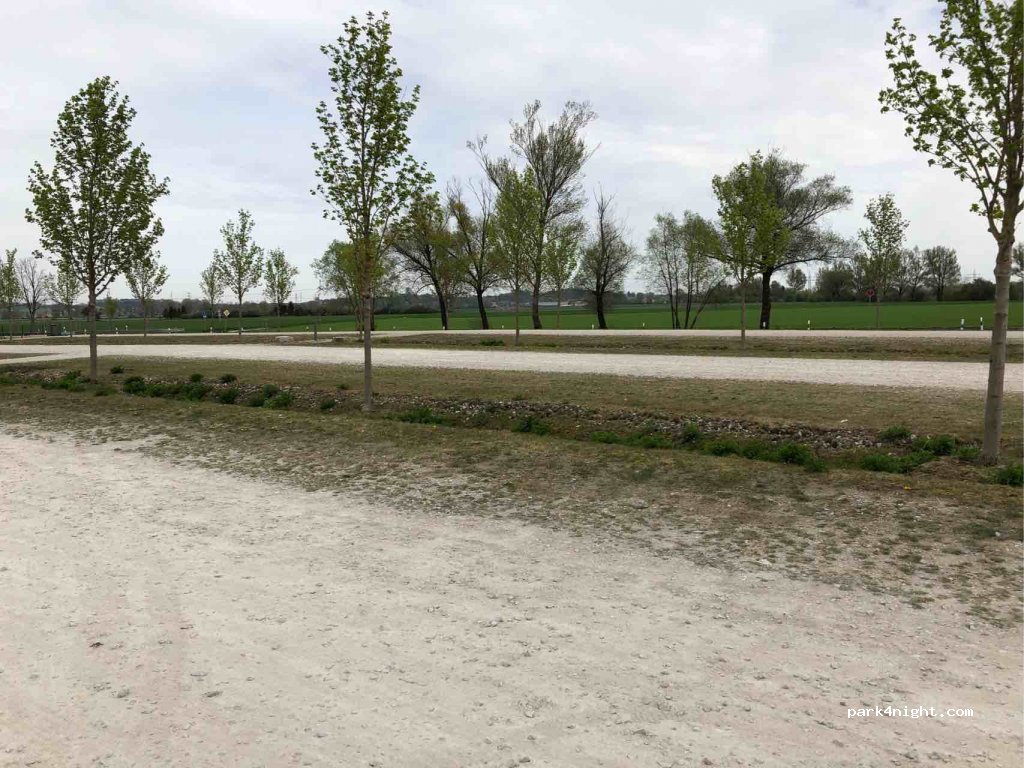 Parkplatz Eisolzrieder See. Die Einfahrt könnte mit etwa 3,5 m und enger Kurve Probleme für größere Fahrzeuge bereiten. Untergrund Rasen und Schotter, eben. Unbeleuchtet, kaum Schatten. See hat große Wiese, Kiosk und Beachvolleyball. Autobahn deutlich hörbar..