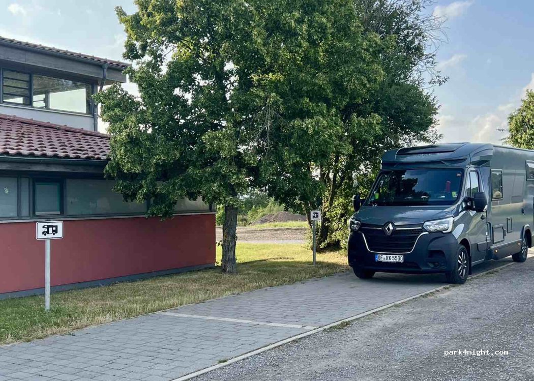 Ruhiger Platz. An der rechten Seite der Halle wurden neuerdings 2 Stellplätze für Wohnmobile mit Schildern markiert und eine gepflasterte Stellfläche eingerichtet. (Foto)