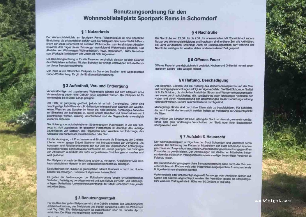 Neuer Wohnmobilstellplatz ""Sportpark Rems". Strom, Frisch- und Abwasser, Entsorgung möglich. Restaurant und Lebensmittelgeschäft im 5 Minuten Fußweg erreichbar. Betreiber: Stadtverwaltung Schorndorf