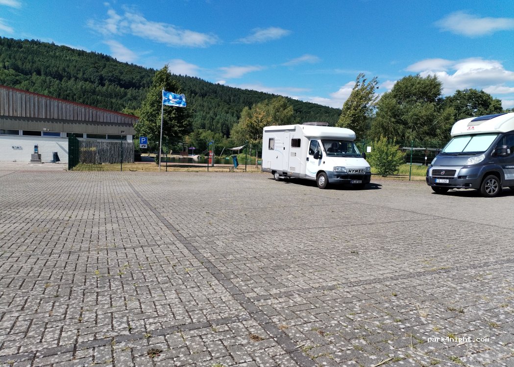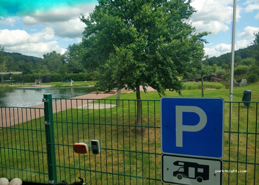 In the parking lot of the Altengronau outdoor swimming pool, 5 parking spaces for motorhomes are available with the possibility of connecting electricity. There is also fresh water and the possibility of emptying gray water and toilets. We were there in April where the outdoor pool is still closed and there was ample parking for ourselves. A meadow is right next to it and also a public barefoot path. Very quiet place, very nice to stay.
