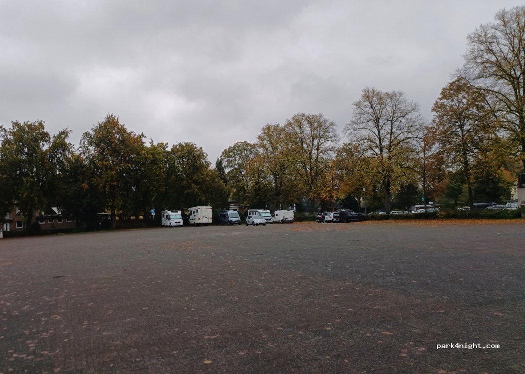 Großer Platz mit für einem für Wohnmobile ausgewiesenen Bereich. Der Platz wird für größere Veranstaltungen wie Zirkus oder Schützenfest auch mal für längere Zeiträume abgesperrt. Er liegt zentrumsnah und an einer gut befahrenen Hauptstraße. Örtliche Größen des Tauschhandels teilen ihn nächtens mit sich stark und jung fühlenden, lautstark auftretenden Helden und deren weiblichen Anhängerschaft.
