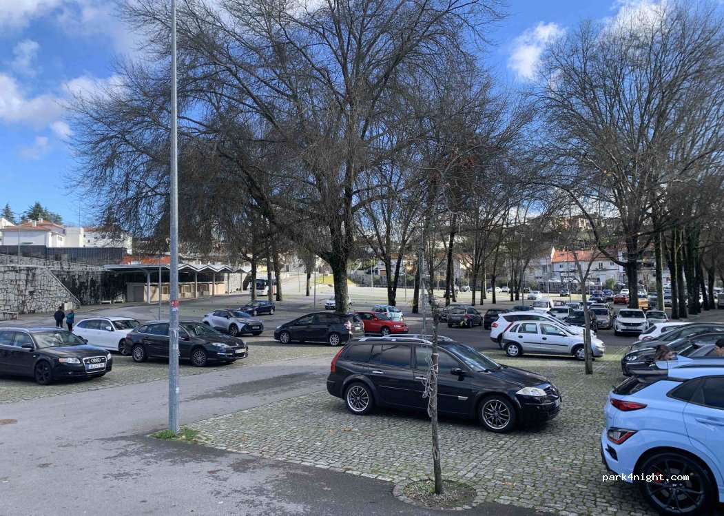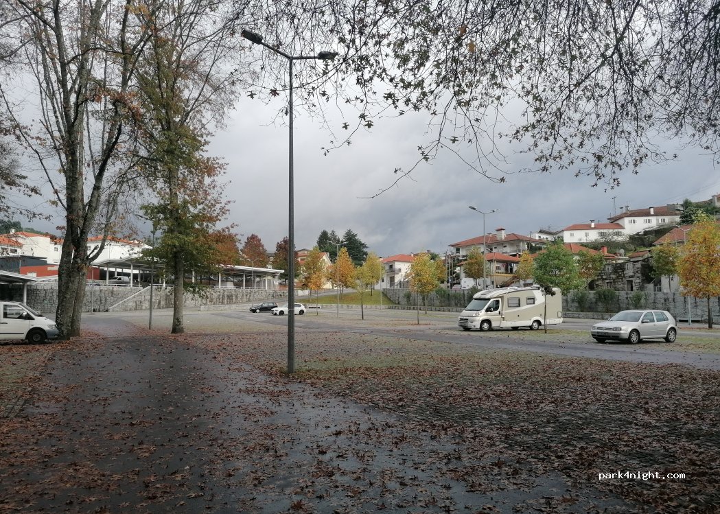Grand parking public gratuit à PÓVOA DE LANHOSO, petite ville, appelé « CAMPO DA FEIRA », où se tient un marché en plein air tous les jeudis (stationnement interdit depuis mercredi soir). Remarques : À utiliser uniquement lorsque le parking camping-cars spécifique, situé à 200 m, est complet.