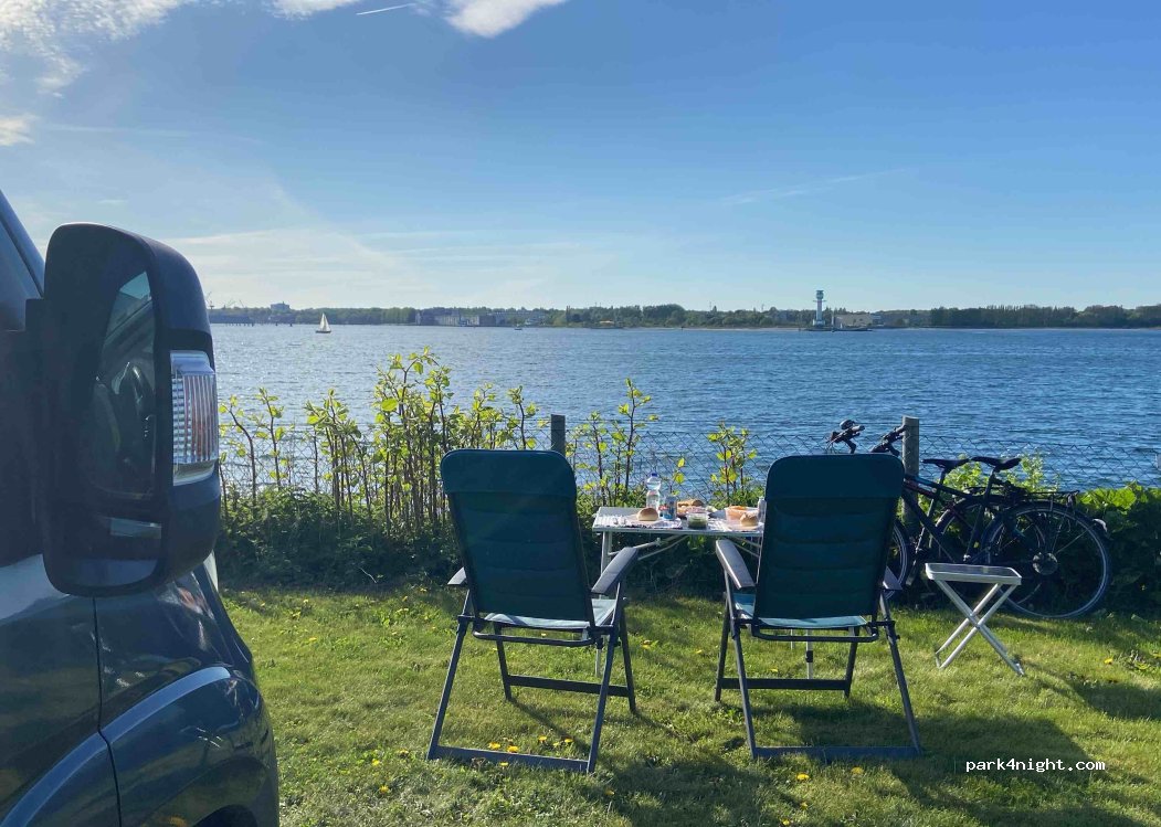 Wenn man die Regeln beachtet (vor der Anmeldung in der Wartezone parken, die Öffnungszeiten beachten) alles super! Haben, trotz kurzfristiger Anfrage, einen sehr schönen Platz in zweiter Reihe mit Blick auf die Förde mit Sonnenuntergang bekommen und jede Menge interessante Schiffe gesehen. Mit dem Fährschiff kommt man sehr unkompliziert (mit D-Ticket sogar kostenlos) nach Kiel.
