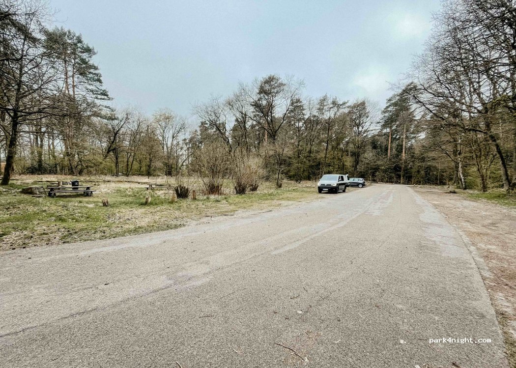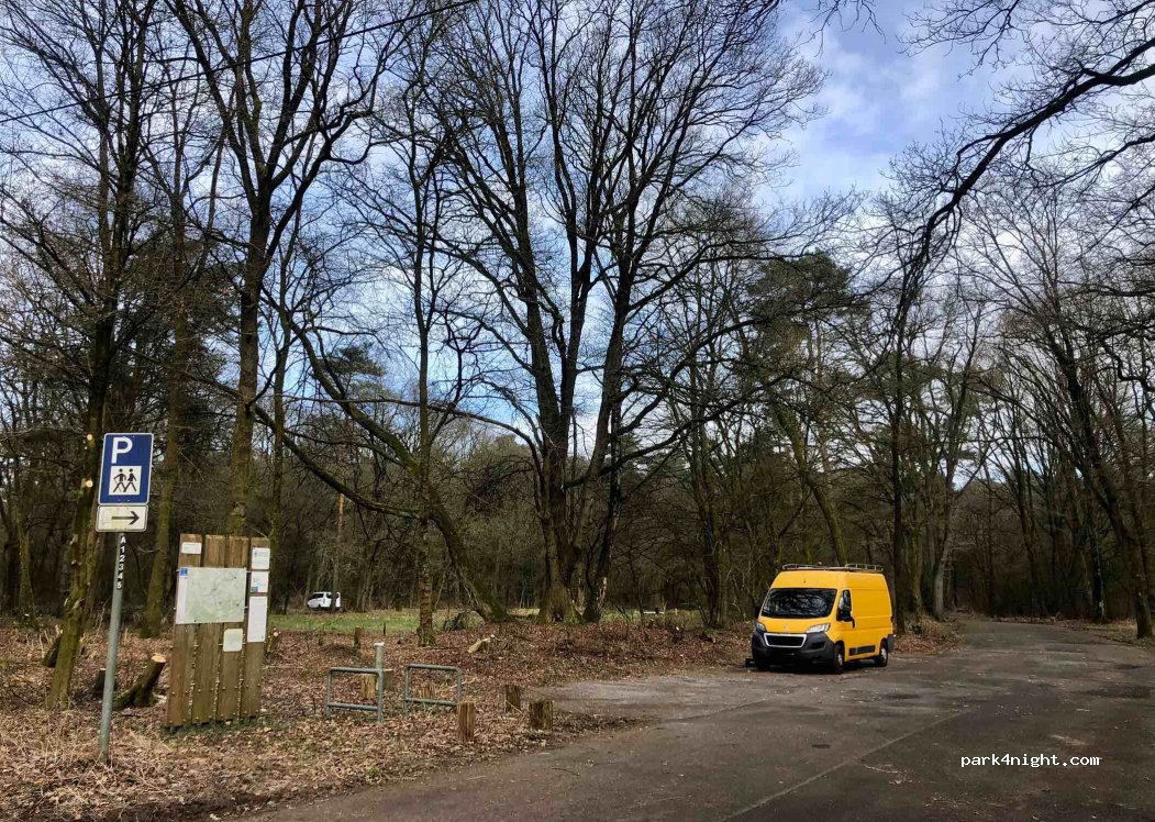 Kleine wandel-P aan de rand van het bos. Verhard, voornamelijk schaduw, geen voorzieningen, behalve prullenbakken en een oude picknicktafel. Korte plekken; wij hebben achteraan scheef gestaan met onze achterkant in de brandnetels. De P is een halve cirkel, dus je kunt ook nog doorrijden. Daar zijn de prullenbakken. Heel rustig overdag en doodstil in de nacht. Slecht internet.