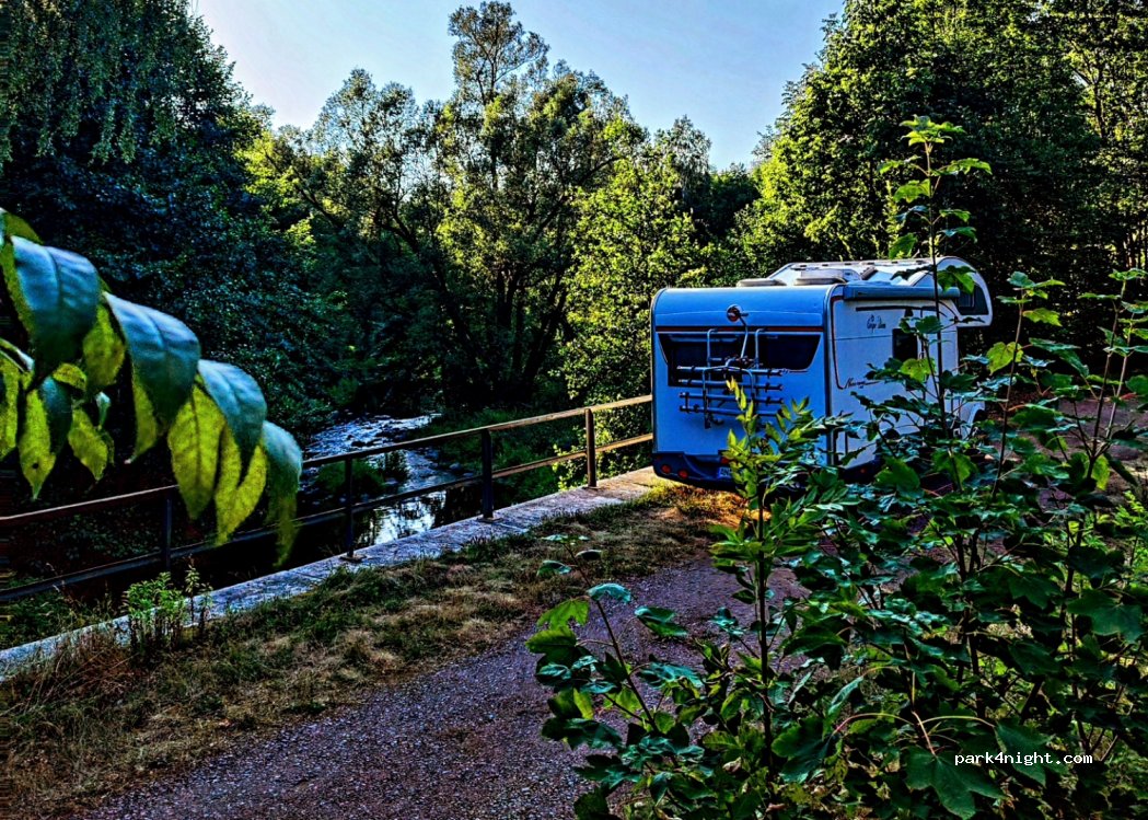 Bel endroit calme au bord du vieux pont ferroviaire. Les véhicules de plus de 5 m doivent simplement reculer de 100 m depuis la route jusqu'à l'espace de stationnement. Les virages sont possibles, mais détruisent inutilement la végétation locale.