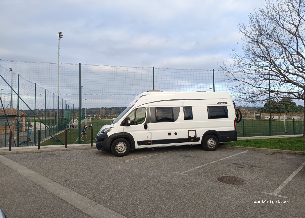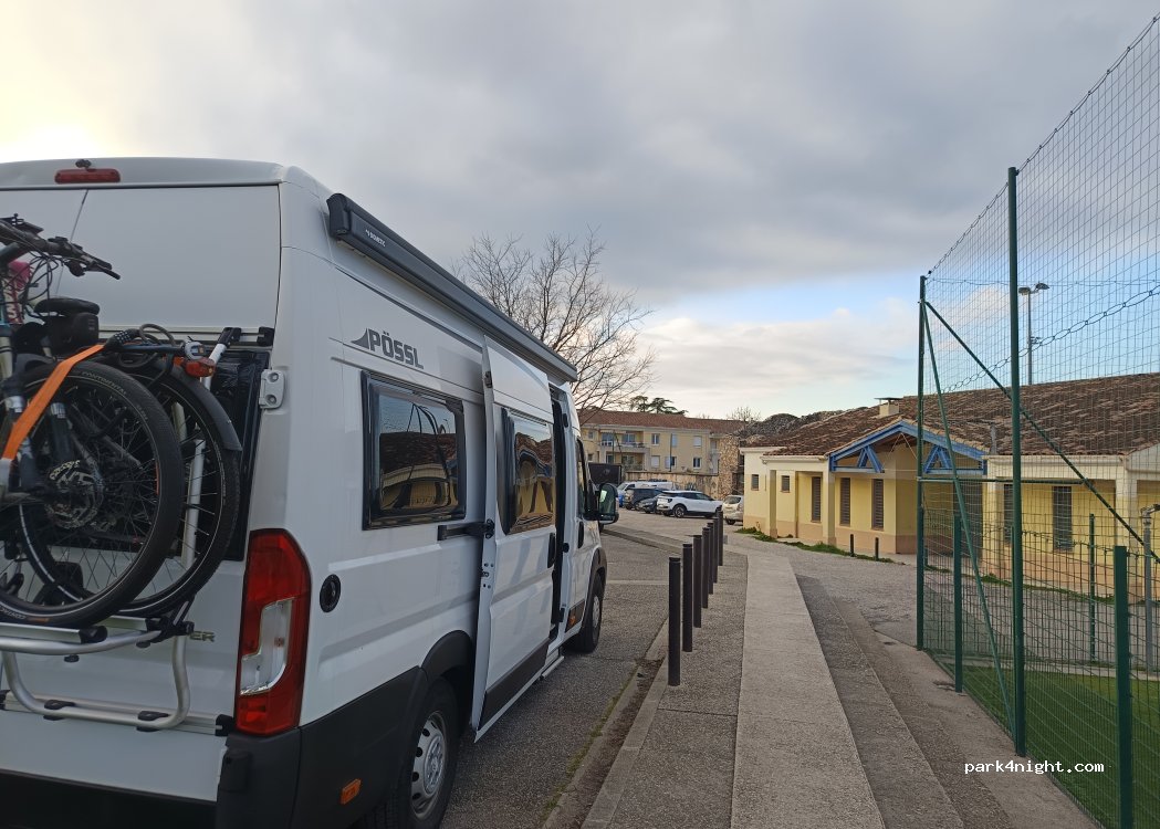 Parking du centre sportif. Seul parking où j'ai pu me garer à St Maximin, les autres sont saturés de véhicules. À proximité de la basilique.