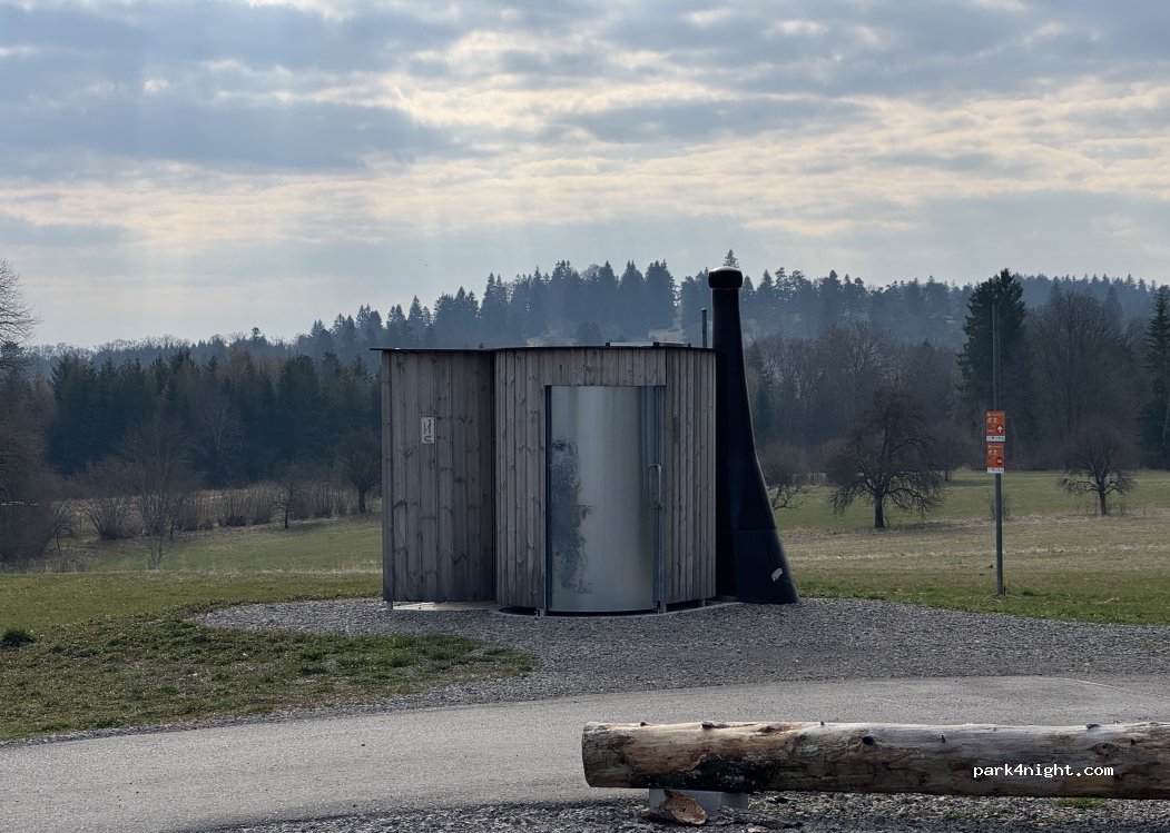 Am Parkplatz ist inzwischen eine Trockentoilette mit Extra-Pissoir aufgestellt. Sauber und luftig. Der Parkplatz ist in einem sauberen Zustand.