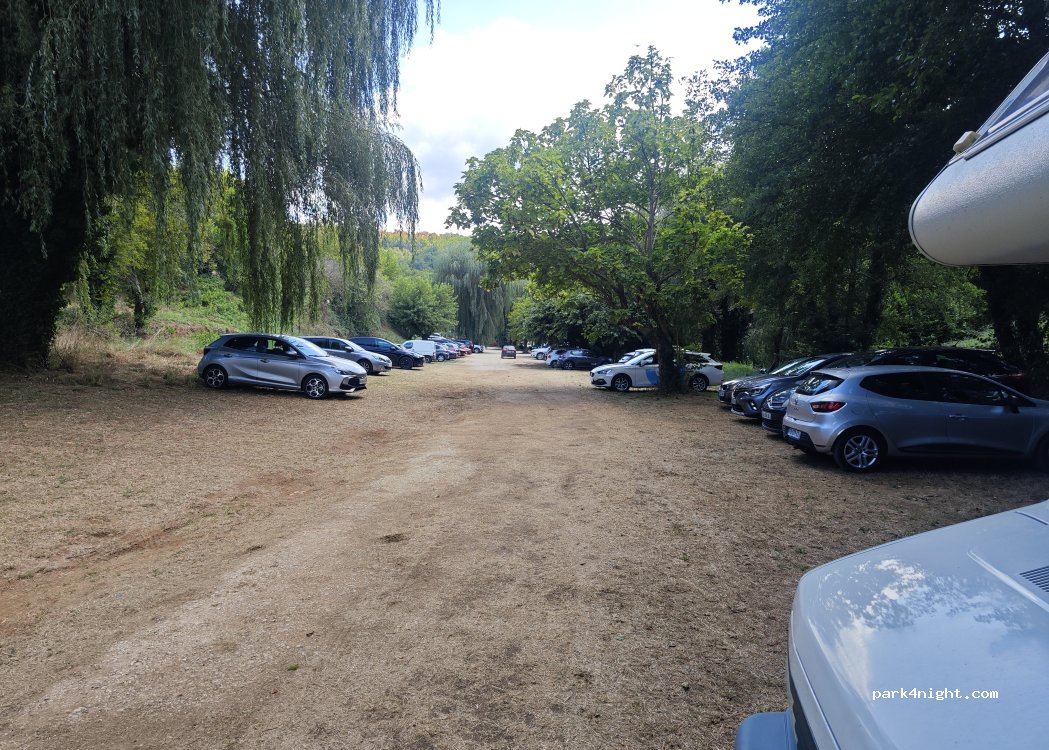 Parking provided for visiting the village and the castle, on clay, by the river and surrounded by greenery. Quiet in the off-season, against the summer, be careful not to occupy too much space. Excellent restaurant "Les Bons Enfants" nearby, very good meal and welcome. No service, night possible. No network and no TV.