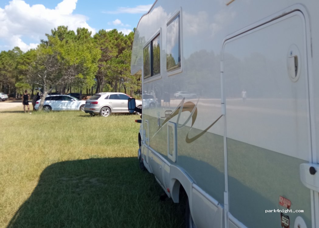 Grand parking avec possibilité de se mettre sous les pins pour un peu d'ombre ou sur l'herbe vers la plage. Facile d'accès. Calme la nuit. Douches et WC à côté du bar.