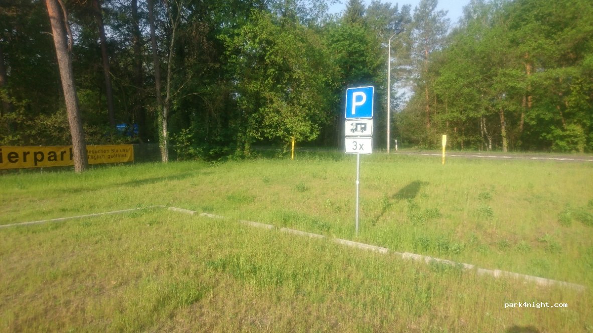 Navigation über Google Maps passt nicht ganz. Einfach weiter zum Tierpark fahren. Abschüssig nach hinten. Kein Schatten, relativ ruhig (direkt an der Straße). Bitte mal das Gras mähen :-)