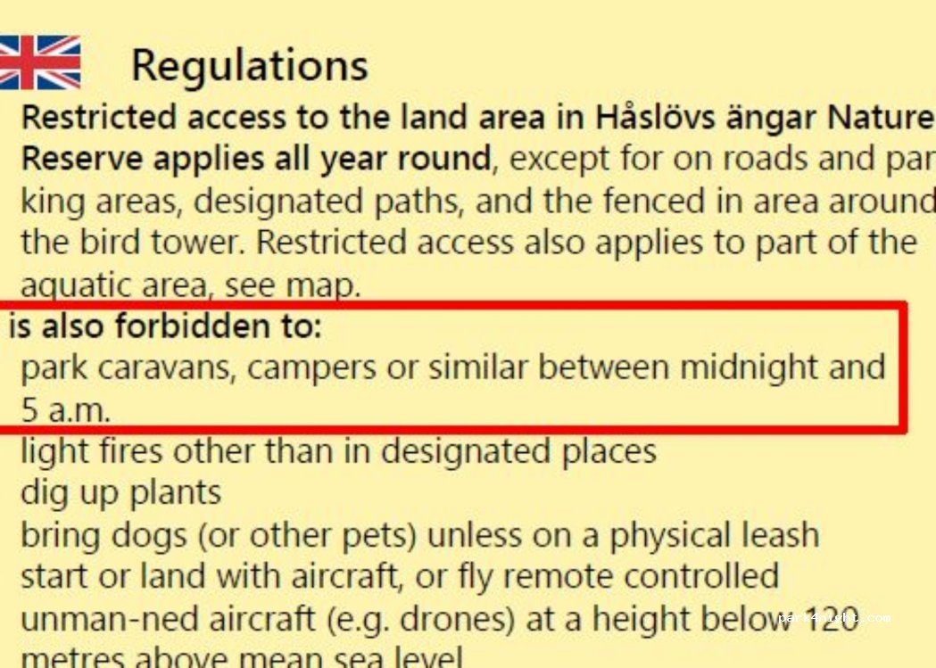 Parkplatz des Naturreservats Håslövs ängar. Vor Ort keine Hinweise auf Parkbeschränkungen, allerdings gilt laut der amtlichen Webseite bei lansstyrelsen.se (wegen des Linkverbotes hier: Namen googeln) zum Schutzgebiet für Wohnmobile etc. ein Parkverbot zwischen 0 und 5 Uhr. Der Parkplatz sollte in Park for Night also wohl besser als Tagesparkplatz vermerkt werden!