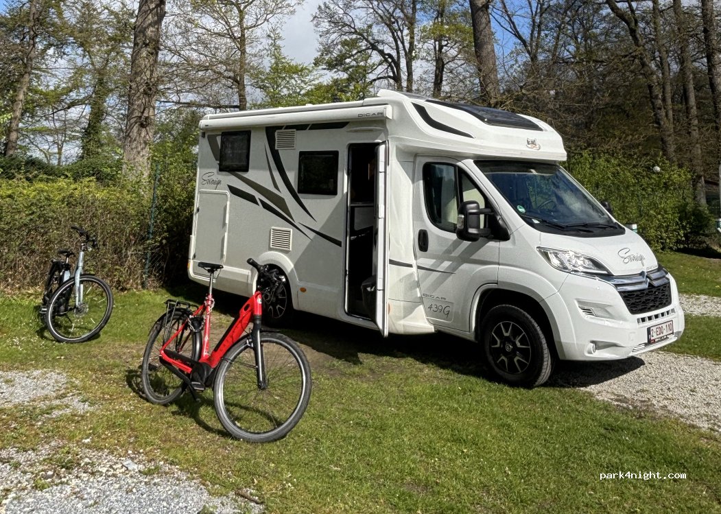 Espace dans un camping, mais tout séparément. Moitié gravier moitié herbe. Tout propre. Tout se passe à la machine. Sauf que le W-lan est demandé à la réception. Bel accueil !