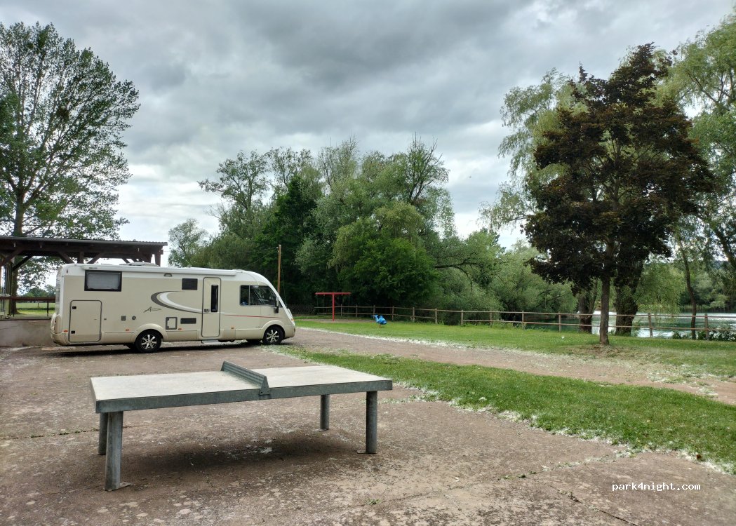 Schöne Parkwiese, für 1-2 Nächte ideal. Es waren auch noch weitere Camper hier. Der See ist sehr idyllisch mit schönem Sonnenuntergang! Auch perfekt um Kajak zu fahren. Ab Nachmittag ist der Parkplatz etwas voller, wegen der Freibadbesucher. Das Kieswerk gegenüber ist zwischendurch laut aber nicht störend. Als Zwischenstopp weiterzuempfehlen.