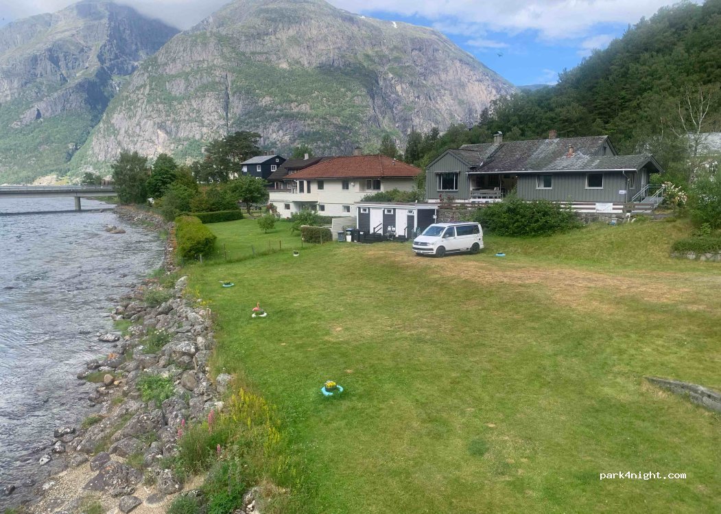 Piccolo campeggio molto carino in riva al fiume su fondo erboso, di fianco al ponte pedonale oltre al quale sei nel minuscolo centro di Eidfjord. Ragazzo già presente, possibile pagare anche con carta. Fondo regolare nei posti lontano dal fiume, con il van ci siamo messi lì. Se ti sposti metti due seggioline e ritrovi il tuo posto.
