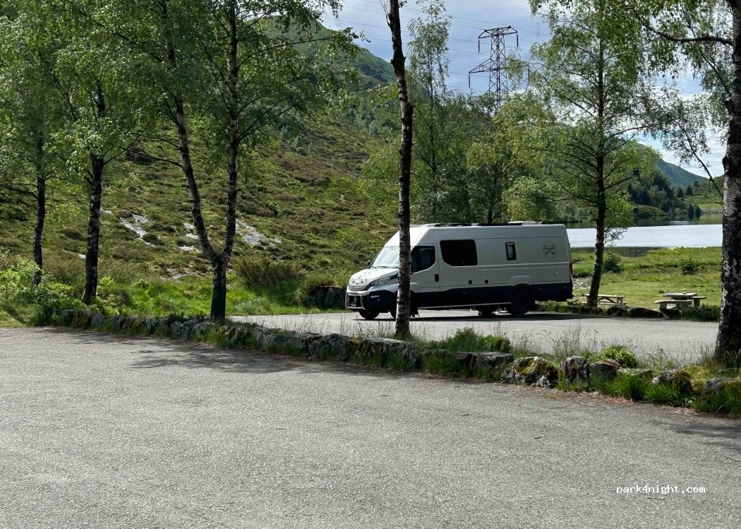 Toller großer Parkplatz direkt am See bzw. Bach. Oberhalb beginnt ein Wasserschutzgebiet, am Parkplatz selbst kann man aber baden. Vom Parkplatz aus starten viele schöne Wanderungen. Komposttoiletten sind vorhanden. 5G-Internet. Die Fahrt nach Bergen dauert etwa 35 Minuten. Kostet 150 NOK pro Nacht.