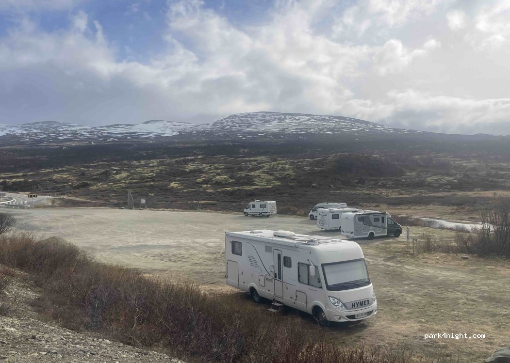 très bien pour une nuit, calme et accessible à tous les gabarits. place pour 10 cc environ. si vous voulez être seul, plusieurs options dans les environs, sur le chemin vers le point de vue du Snohetta (à voir!), et rivière à proximité pour un peu d'eau.
