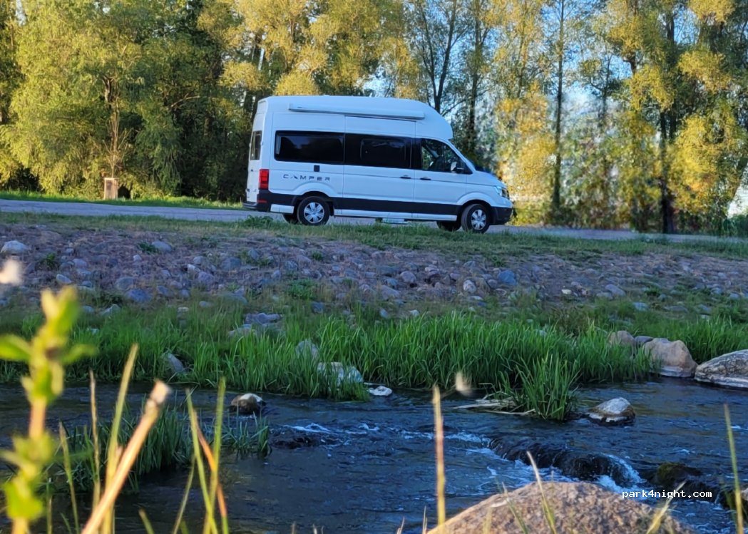 einfacher Parkplatz direkt an einem Fluss. dieser ist an dem Parkplatz durch Fischtreppen besonders schön aufgewertet. wir standen hier eine Nacht auf der Durchreise nach Schweden. ein kleines Manko ist der Verkehr und die Brücke wo dieser drüber muss, da man das schon gut mitbekommen und auch hört