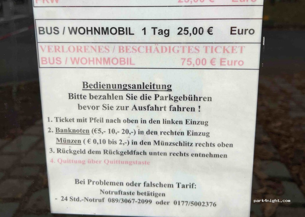 Sind 2 Nächte wegen Depeche Mode Konzert dort geblieben und haben 16€ bezahlt( 6m Kastencamoer, Einfshrt Montags0.45Uhr bis Dienstag 23.00Zhr! Super Mut Fahrrad in 20 Minuten am Marienplatz!! Ausfahrt nach Konzert war suoer, wir waren aber szch schnellund oarkten an Block 16. Keinerlei Infrastruktur wie WC/Strom/Einkaufsmöglichkeiten