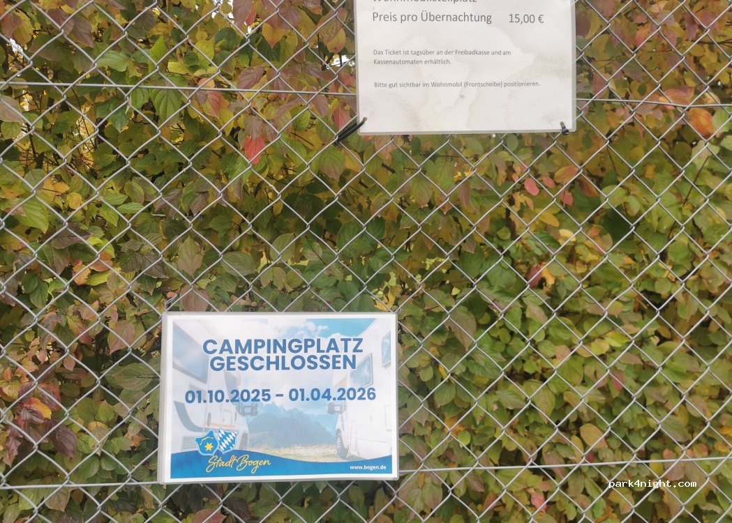 Ein Kompliment an die Stadt Bogen, der Stellplatz hat alles was man braucht, Platz steht ausreichend zur Verfügung. Das Freibad ist geschlossen, ein Anruf bei der Stadt und es wird geholfen. Heute wurden Schilder angebracht mit dem Hinweis wo jetzt die Gebühr zu entrichten ist. Das nenne ich Service.