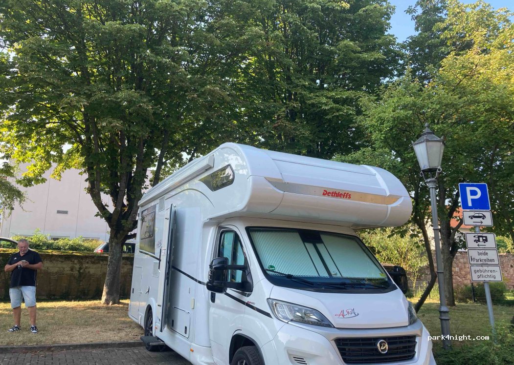 9 € mit Kurtaxe für 2 Personen, schräg,Stützen/ Keile notwendig. Plätze sind im hinteren Teil eines öffentlichen Parkplatzes reserviert. ruhig -trotz Stadtmitte,jetzt 10 Plätze mit Strom, eng nebeneinander, wenn alles belegt ist.