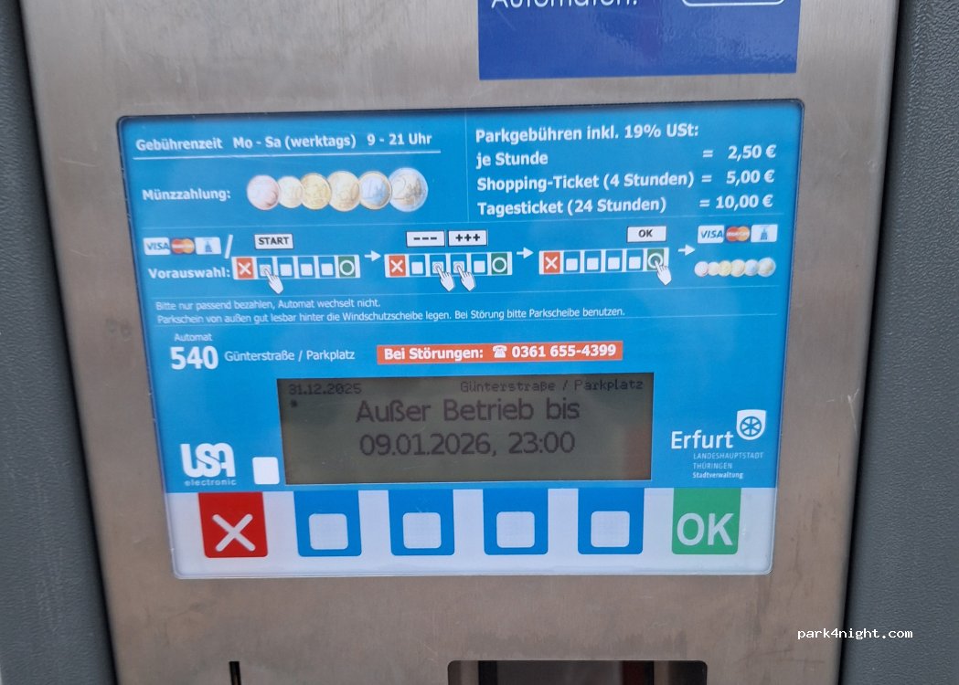 Öffentlicher Parkplatz mit der Option der 24-Stunden-Nutzung (siehe Foto für die Gebühren). Trotz dass keine Höhenbegrenzung besteht, ist zu empfehlen mit nicht zu großen Wohnmobilen anzureisen, da der Parkplatz direkt zwischen BAG (BundesArbeitsGericht) und einem Wohngebiet liegt (um dezent zu bleiben und Lage Spaß an diesem „Geheimtipp“ zu haben). Selbst wenn der Parkplatz von Schienen der Straßenbahn umrundet ist, ist er sehr sehr ruhig, im Besonderen, wenn man bedenkt dass er sich in unmittelbarer Stadtkernnähe befindet. BESONDERHEIT: Nach wenigen Metern erreicht man die nahegelegene Haltestelle der Straßenbahn-Linie 4, die direkt in den historischen Stadtkern führt (Domplatz, etc.). ACHTUNG: Zeitlich begrenzte Toilettennutzung, aber extrem sauber (Mo-Sa/7-22 Uhr).
