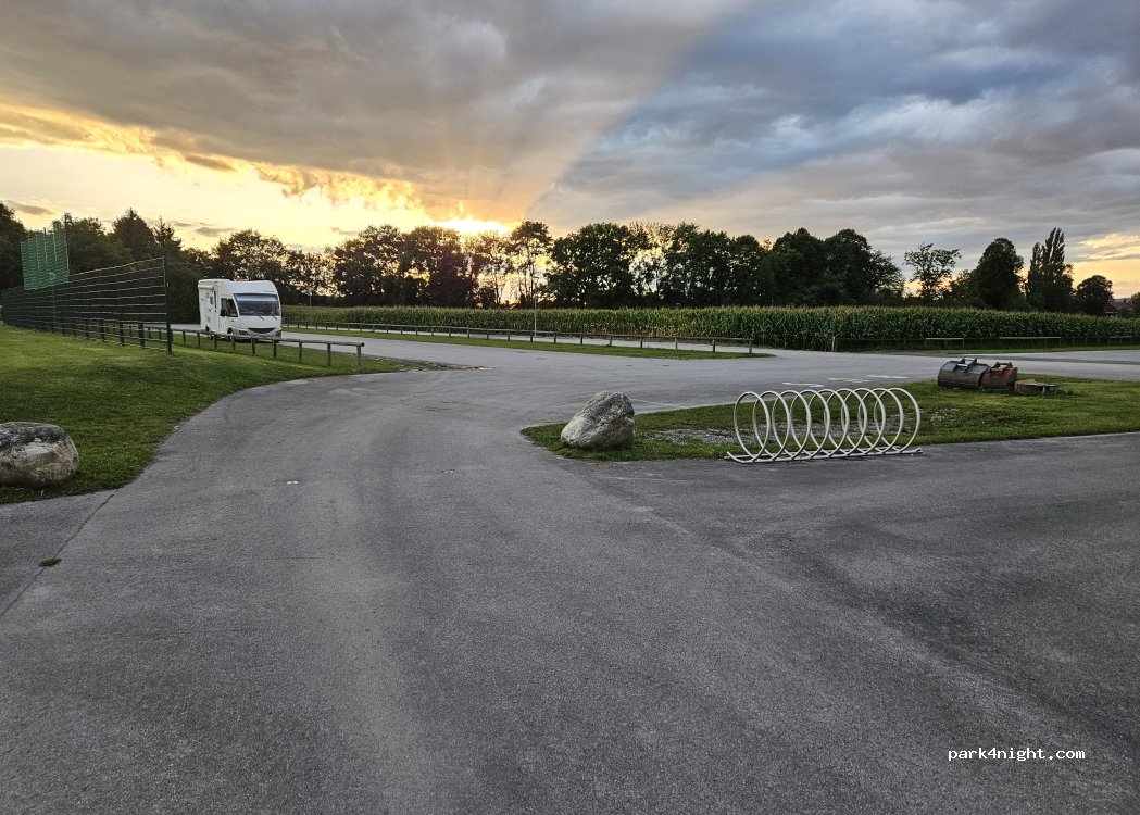 Schöner Platz, wie in den vorherigen Rezensionen berichtet. Öffentliches WC, Wasserstelle usw. Aktuell leider Baustelle auf dem Sportvereinsgelände - piep piep ab 7 Uhr, LKW etc. Um 6.30h hatte die Kommune bereits den Traktor zum Rasenmähen auf dem Freizeitgelände aktiviert mit Motorsense im Anschluss - 5 Meter neben dem Parkplatz.