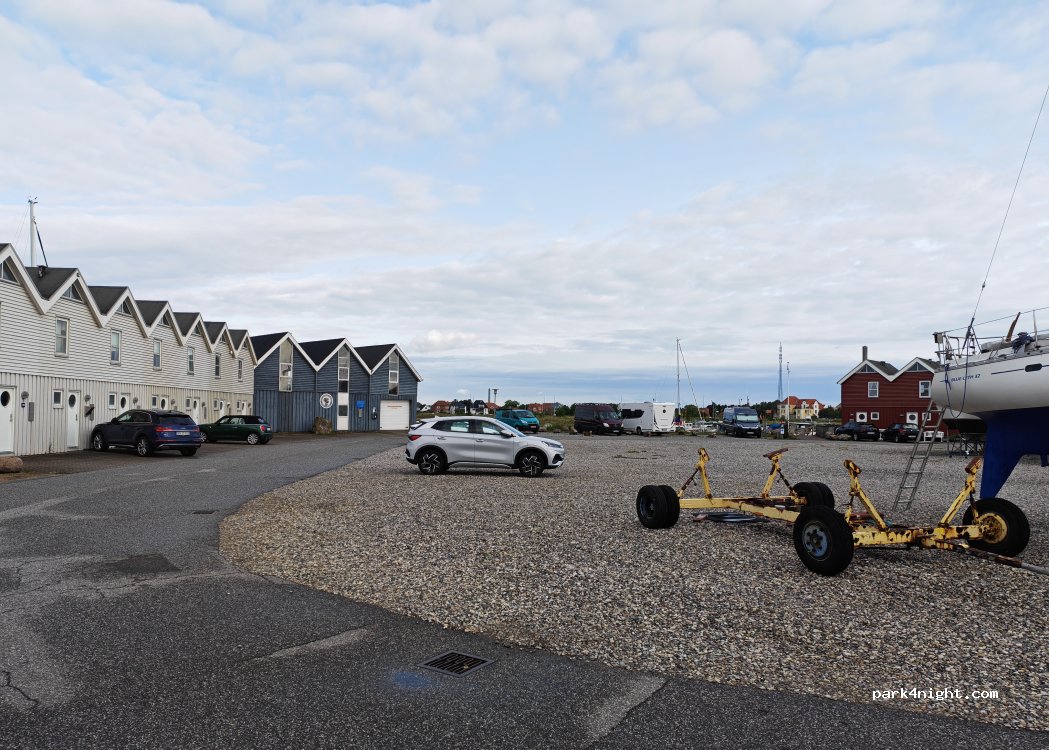 Aire à la marina, sur graviers en deux zones de 5 emplacements, la première devant le Havnekontor, la seconde 40 mètres plus loin.