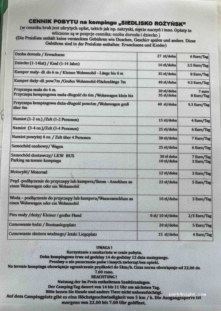Alles super wie schon beschrieben. Mittags gibt’s ca 13 Uhr ein Tagesessen für 20Zl- lecker! Tor wird 22 Uhr geschlossen und dann gilt Ruhe auf dem Platz. 148Zl für 1 WoMo, 4 Personen, Strom incl warme !Duschen und saubere Toiletten (werden mehrmals tgl gereinigt). Trampolin,Tischtennis,Kicker, Spielplatz. Mehrere Lagerfeuerstellen. Kleiner Laden 20min zu Fuß .Wohlfühlplatz! Große Empfehlung