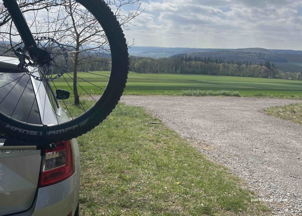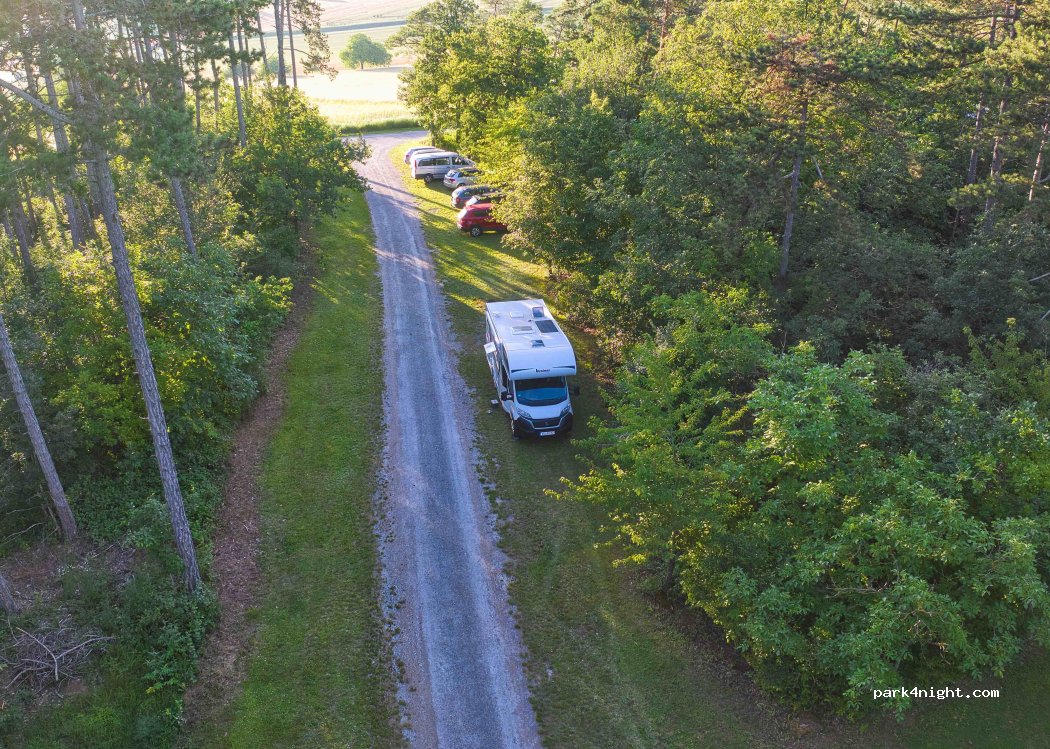 Lawn parking lot of the sports ground. On a hill, surrounded by trees, with shade. We stood here alone and very quiet. Probably that is different when there are sports events.
