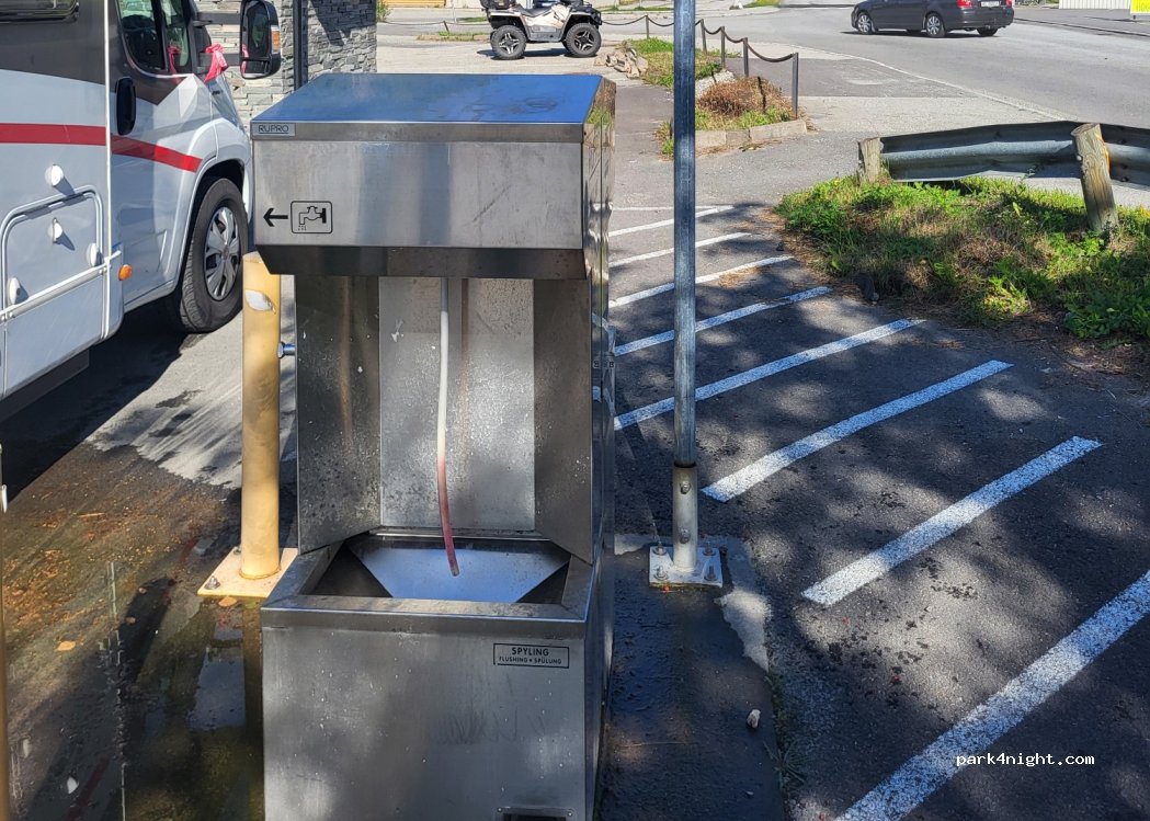 Goede plaats om water te tappen, afval weg te gooien en grijs en zwart water te lozen. Vlak langs de weg. De parking staat goed vol overdag rond 12:00 uur. Rechte parkeerplaatsen.