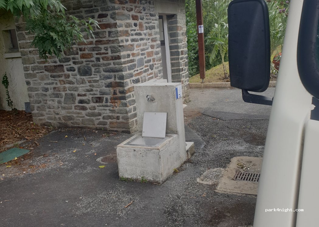 Parking propre avec vidange et eau près de l’église. Joli village avec crêperie sympa et personnel agréable.