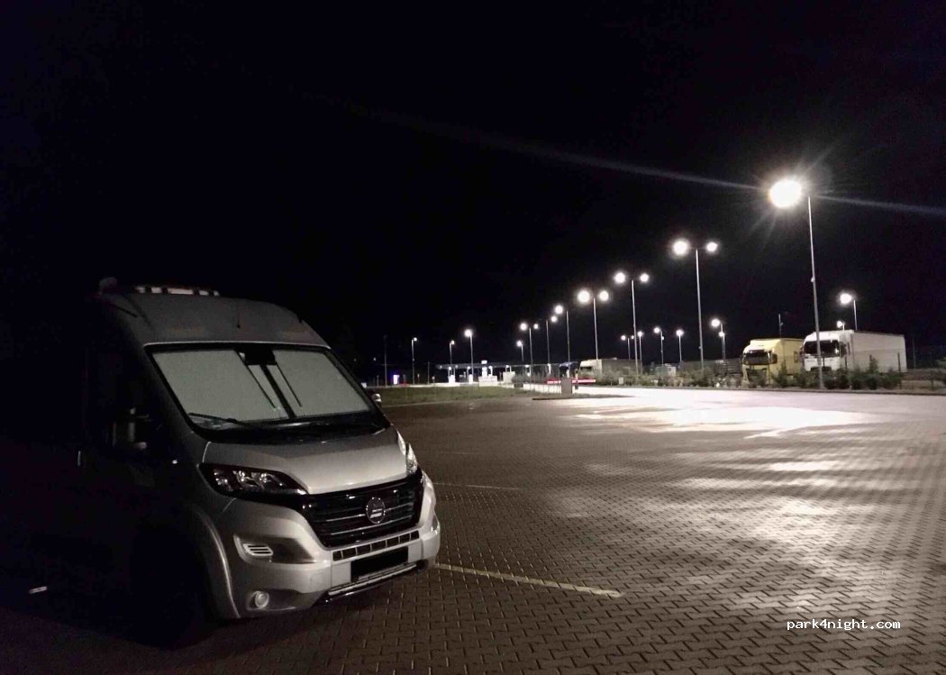Velmi dobrý přespávací stellplatz. Blízko dálnice, dlážděný s veškerým servisem. Noc za 10Euro, dá se přikoupit elektřina. Provoz 24/7. Spojeno s parkovištěm kamionů, hotelem, restaurací, hlídané, čisté, udržované. Vlastní čerpací stanice s levnější naftou.