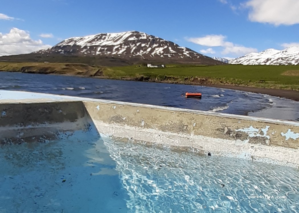 Nous y avons passé une nuit. Au petit matin nous avons profité des hots tubes avec vue sur le fjord et les montagnes, un pur bonheur ! Cet endroit est juste parfait pour les routards avec des équipements sommaires mais qui remplissent leur office.