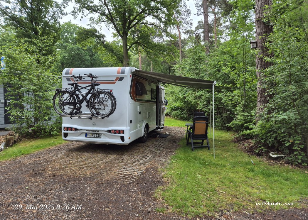 Mooie camperplaats onder de bomen. De opstelling van de camperplaatsen is top ! Er ligt ook een fantastische sauna op 10 min wandelen in de buurt. Er is echter 1 groot minpunt als je komt voor de rust van de natuur en dat is het constante lawaai van de autobaan. Maar een top plaats als je je daar niet aan stoort.