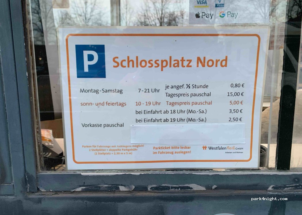 Wir sind um 13:30 Uhr angereist und mussten 13,50€ bezahlen. Platz genug. Innenstadt und Aasee zu Fuß schnell zu erreichen.